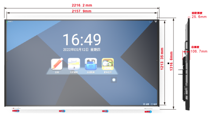 3)标配高精度红外触摸条:1-触摸精度<1mm;2-支持2支2mm笔尖书同时写;3-支持5支3mm笔尖同时书写;